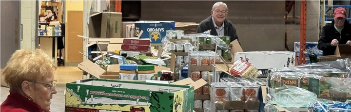 Jack, Carolyn and Rick work as filling individual bags for clients of the Food Bank.